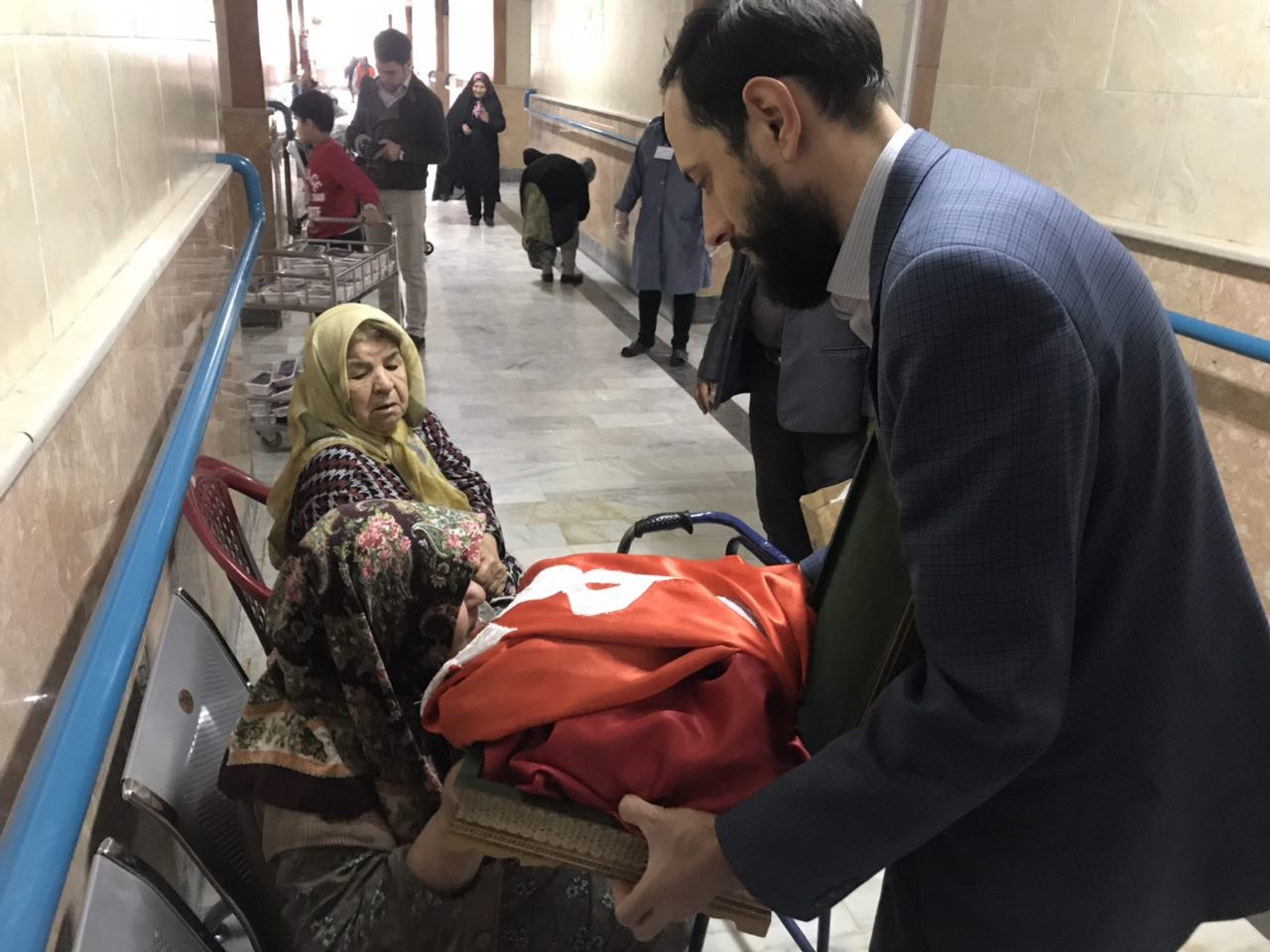 حضور خادمین هیات حضرت ابوالفضل (ع) اصفهان با پرچم های مقدس گنبد امام حسین (ع) و حضرت ابوالفضل (ع) در خیریه سالمندان صادقیه در روز ۲۳ فروردین
